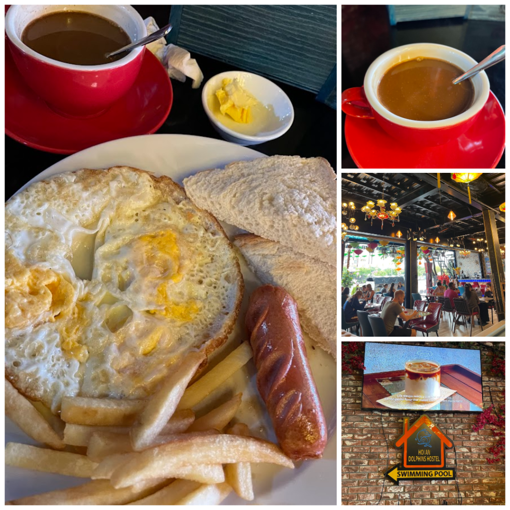 For my late breakfast, I returned to Dolphin Hostel—a great go-to spot, especially with its cozy riverside view and warm, welcoming vibe. I ordered an English breakfast and a cup of hot coffee. It was a satisfying meal on a gloomy Hoi An morning. They still had Vietnamese egg coffee too—another treat worth savoring slowly while watching the river flow.