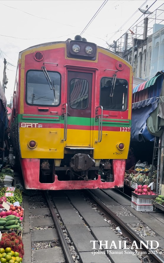 Soon after we arrived, our guide announced that the next train would pass by at 9 AM. I got excited like a true railway enthusiast! While waiting, we wandered through the market—a maze of fresh fruits, souvenirs, clothing, and local eateries all set up along the tracks. Vendors calmly doing business beside the rails? Only in Thailand!